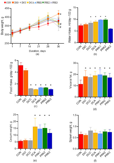 At the end of the study, animal body weight was significantly higher in the DIO group compared to the CON group (p < 0.05; Figure 2a). At the same time, body weight was significantly smaller at day 35 in DCC and DCA groups than in the DIO group (p < 0.05). There were no other intergroup differences in body weight. Water intake was higher in DCC, DCA, PRK1, and PRK2 groups compared to the CON group (p < 0.05; Figure 2b). Food intake has been found to be significantly lower in DCC, DCA, PRK1, PRK2, and PRK3 groups compared to the CON group (p < 0.05; Figure 2c). Visceral fat weight was higher in studies on all groups in comparison to the CON group (p < 0.05; Figure 2d). Caecum weight was significantly greater in DCA, PRK1, PRK2, and PRK3 groups versus the CON group (p < 0.05; Figure 2e). There were no differences in spleen weight between the groups (Figure 2f).