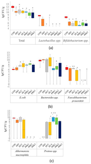 Effects of different treatments on the composition of intestinal microbiome. Bacterial counts were analyzed in fecal samples obtained at the end of the experiments using RT–PCR. (a) Total bacterial count, Lactobacillus spp., Bifidobacterium spp.; (b) E. coli, Bacteroides spp., Faecalibacterium prausnitzii; (c) Akkermansia muciniphila, Proteius spp. Data are expressed presented as box plots with median and quartiles as well as whiskers to express minimum and maximum values. * indicates p < 0.05 when data is compared to that for the CON group; ** indicates p < 0.05 when data is compared to that for the DCA group.