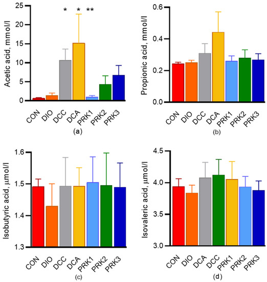 Serum levels of acetic, propionic, isobutyric, and isovaleric SCFAs at the end of the experiment are shown in Figure 4. Serum acetate level was significantly higher in the DCC and DCA groups in comparison with the CON group (p < 0.05, Figure 4a). In the PRK1 group, acetate concentration was not different from the controls; furthermore, it was significantly lower than in DCA group (p < 0.05, Figure 4a). Propionate level tended to be higher in the DCA group compared to the CON group, but the difference was not statistically significant. The levels of isobutiric and isovaleric acids were not different among groups (Figure 4c,d).