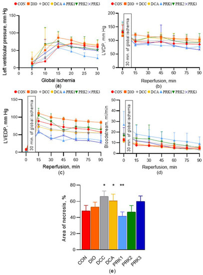 Myocardial infarct size was 49 ± 8% in the CON group (Figure 5e). Infarct size was not different from the controls in the DIO group (53 ± 7%, p > 0.05). In DCC and DCA groups, infarct size was significantly larger than in the CON group (66 ± 7 and 60 ± 8 %, p < 0.05). Importantly, infarct size was significantly smaller in the PRK1 group compared to that in the DCA group (41 ± 5%, p < 0.05). It also tended to be lower than in the CON group, but this difference has not been proved statistically. Infarct size in PRK2 and PRK3 groups was not different from either the CON group or the DCA group.