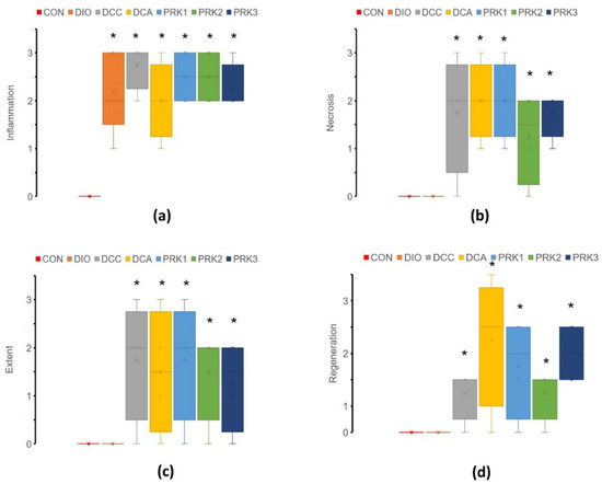 Histopathological colitis scores. (a) Inflammation; (b) necrosis; (c) extent; (d) regeneration. Data are expressed presented as box plots with median and quartiles as well as whiskers to express minimum and maximum values. * indicates p < 0.05 when data is compared to that for the CON group.