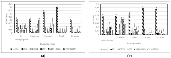 Last, but not least, most of the fermented products showed inhibitory activity against several bacterial strains used as indicators. They were able to prevent the growth of pathogens/spoilage bacteria when these were intentionally added (in concentrations up to 10%) to the cell-free supernatants. It is known that LAB are antagonistic toward various bacteria that may be present in raw materials and may cause unpleasant changes in the organoleptic properties [48], and therefore, they may find application in the food industry. This might be also the case for the strains used in this study, especially for L. plantarum BR9 and L. acidophilus IBB801, which inhibited the growth of most indicator bacteria, even when these were inoculated in a high concentration. Such strains may be used to reduce the amounts of preservatives added to foods, being a much healthier, non-toxic, and non-allergenic alternative to these chemical compounds.
