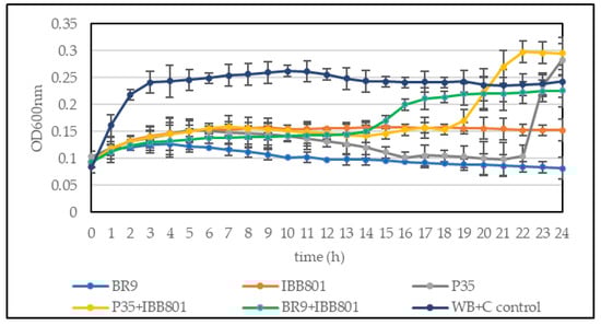 When a higher concentration of inoculum was used (10%), E. coli and B. cereus growth was completely inhibited in all drinks (Figure 3). The other pathogens, but especially S. enterica, were able to grow in some drinks (such as those obtained with L. plantarum P35 and with the co-cultures), up to OD600nm of 0.1–0.2. The values were higher, in general, in the WB + C variants. However, the growth of the pathogens started much later (after 16–20 h) in these drinks as compared with the controls (Figure 4).