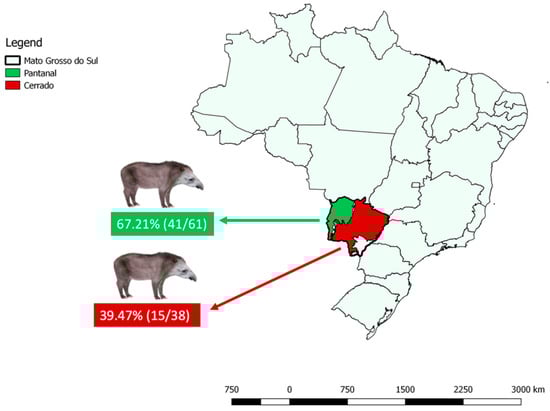 Number of tapirs from each biome that presented blood DNA samples with bands of expected sizes on agarose gel electrophoresis when tested for partial Piroplasmida 18S rRNA gene by nested PCR analysis [] in Mato Grosso do Sul State. This map was constructed using QGis v. 3.26 software (http://qgis.org, accessed on 26 October 2022).