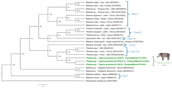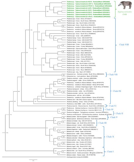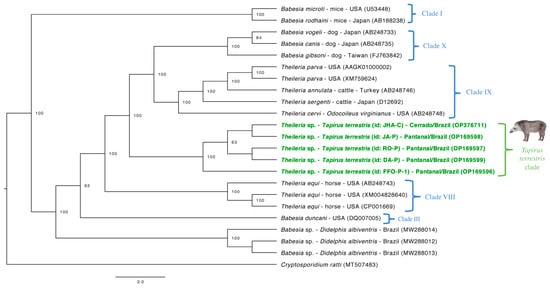 Theileria sp. in free-ranging lowland tapirs was reported in post-mortem blood and spleen samples from road-killed animals from the Pantanal biome (Mato Grosso State) []. When fragments of approximately 740 bp were analyzed by Bayesian phylogenetic inference, these sequences (GenBank access no. MZ491096, MZ490586) clustered together in a clade with Theileria sp. previously reported in cats from Brazil (GenBank access no. KP410270-KP410273, KF970930) [,] and closely related to an T. equi clade []. Unfortunately, near-full length 18S rRNA from Theileria genotypes from cats are not available, precluding a better assessment on the phylogenetic positioning of these sequences within Piroplasmida clades. Indeed, 18S rRNA sequences of Theileria sp. obtained from tapirs with approximately 400 bp already fit in a clade separately from T. equi in Bayesian analysis [], but extended sequences would be significant to highlight the phylogenetic relationship of Theileria sp. obtained from tapirs with those genotypes or species obtained from other wild animals from Brazil.