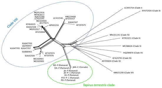 Analyses conducted herein suggested an evident genetic separation between T. equi and the lowland tapir-related Theileria sp. detected in the present study, based on the near full-length 18S rRNA gene of Piroplasmida. The phylogenetic tree constructed using Bayesian inference and a total alignment size of 1460 bp showed a separation supported by high post probabilities values (100) between Clade VIII (Equus group) and T. terrestris clade. A clear separation was also observed on distance analysis performed using Splitstree software. These findings point out the existence of a potentially new Theileria species/phylogenetic group based on the Piroplasmida topology proposal []. The neighbor-joining tree constructed by Jalovecka et al. (2019) [] with an alignment size of 1638 bp also achieved high bootstrap values (100) on separation of clades belonging to Equus group (Clade VIII), Theileria sensu stricto (Clade IX), and Babesia sensu stricto (Clade X) groups, which were the phylogenetically closest clades in their analysis. In our analysis, Equus group and T. terrestris clades fit more closely related to Cytauxzoon group (Clade VI) and distant from Babesia sensu stricto group. These differences may be due to the different sort of inferences used (neighbor-joining x Bayesian) as well as the fact that we included newly reported genotypes, which may influence the achieved topology. Indeed, Theileria and Cytauxzoon share some biological features. The sporozoites of both these representatives of the Theileriidae family are capable of invading hosts’ leukocytes during the schizogony phase followed by the invasion of red blood cells [].