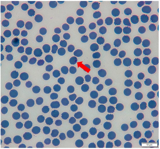 Maltese-Cross inclusions suggestive of Theileria spp. found in erythrocytes of Tapirus terrestris (indicated by the red arrow). Visualization was made by using a light microscope (1000×), during blood smear examination. The animal (ID: PO-P) was positive in a PCR protocol that amplify a fragment of approximately 1500 bp of the 18S rRNA gene from piroplasmids [,] in the present study.