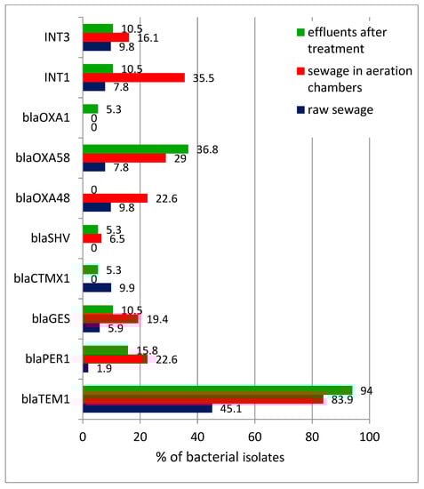 The present study showed that the blaTEM1 gene was the most common at all stages of the wastewater-treatment process, which, as mentioned above, is characteristic of clinical sources of contamination, among others [42]. The analysis of the occurrence of blaTEM1 genes in bacteria isolated at different stages of wastewater treatment showed that: in raw wastewater they were present in 45% of strains; in the aeration chambers their frequency was almost 84%; and in treated wastewater their frequency was 94% (Figure 4).