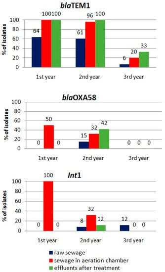 The study also considered the presence of class I (Int1) and class III (Int 3) integrons. As suggested by Tacao et al. [54], class I integrons are more easily exchanged and disseminated among strains characterized by the activity of extended-spectrum β-lactamases. At the same time, they are more frequently detected in environmental samples compared with class II and III integrons [55]. Although integrons are not considered mobile genetic elements per se, their localization on plasmids and transposons gives them the ability to transmit multi-resistance traits [56]. In the present study, we observed both the abundant presence of the Int1 gene (35.5% of isolates from the aeration chambers) and the co-occurrence of the blaTEM1 gene and class I integron. A similar relationship was observed during their study by Li et al. [57].