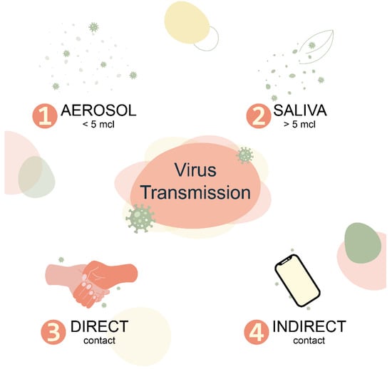 Respiratory viruses belonging to different families differ in the degree of distribution and modes of transmission. Transmissibility, as measured by the basal reproduction number, is not uniform for the same virus. Respiratory viruses can be transmitted in four main ways: direct (physical) contact, indirect contact (fomites), (large) droplets, and (small) aerosols (Figure 1). Little is known about the relative contribution of each regimen to the transmission of a particular virus under different conditions and how its variations affect transmissibility and transmission dynamics. Understanding the relative contributions of different modes of transmission is critical to effective control and prevention strategies [50].