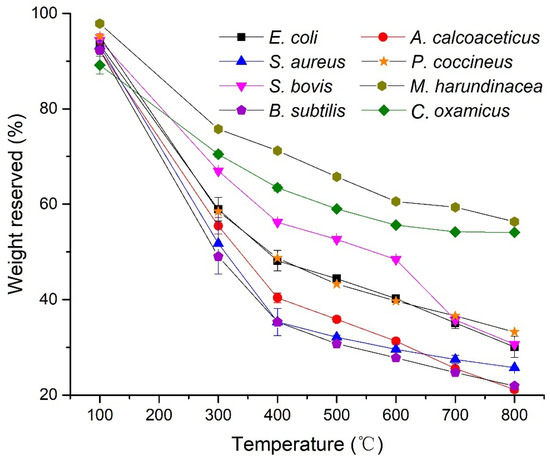 The volatile contents in the microorganisms could vary significantly. In Figure 1, eight strains showed different weight loss with a maximum RSD of 6.4% at different temperatures (with accuracy ± 10 °C) after the programmed pyrolysis (Figure S2). The archaeon M. harundinacea and sulfate reducing bacteria (SRB) C. oxamicus (G−) exhibited a higher temperature resistant characteristic, with a weight loss of less than 50% after pyrolysis from 100 to 800 °C for both the microbes. The anaerobe C. oxamicus (G−) lost 36.5% (±0.7%) by 400 °C and only 15.2% (±0.2%) by 800 °C. E.coli (G−), S. bovis and the fungus P. coccineus had similar weight loss in the mid-range, but S. bovis showed a different pathway at the low temperatures (100–600 °C). A. calcoaceticus (G−), S. aureus (G+) and B. subtilis (G+) indicated a greater weight loss than the rest of the microbes. Particularly, B. subtilis and A. calcoaceticus had weight loss of more than 90%.