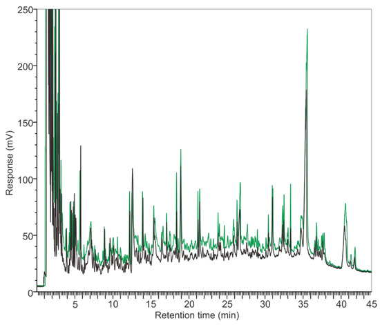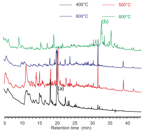 Pyrograms of M. harundinacea at four different temperatures. (Peak a): characteristic peak (retention time of 20.25 min) at 400 °C (black line); (Peak b): characteristic peak (retention time of 32.71 min) at 800 °C (green line).