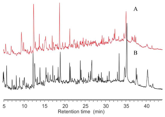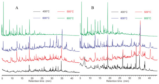 The pyrograms of S. aureus and E. coli at different pyrolysis temperatures are presented in Figure 3. The results showed that S. aureus (Figure 3A) and E. coli (Figure 3B) had pyrograms with similar retention times, at 500 °C, 600 °C and 800 °C, with the exception of 400 °C. These agreed well with the observations of the TGA analysis (Figure 1). The Fungus P. coccineus, bacteria S. bovis (G+), A. calcoaceticus (G−), and C. oxamicus (G−), pyrolyzed at various temperatures, also showed different thermal stabilities, as indicated in the pyrograms (Figures S3–S6). In general, the chromatograms of the right temperatures show more recognizable peaks.