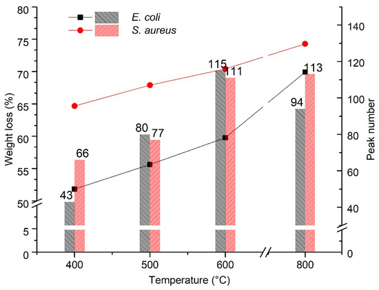 The weight loss and number of peaks in the pyrograms of E. coli and S. aureus at various temperatures are plotted in Figure 4. Based on the statistics of the TGA analysis (Figure 1), S. aureus (G+) clearly lost more components than E.coli (G−) at all pyrolysis temperatures. However, the pyrolysis of E. coli resulted in more peaks, e.g., 80 peaks for E. coli versus 77 for S. aureus at 500 °C and 115 for E. coli versus 111 for S. aureus at 600 °C. As the pyrolysis temperature increased to 800 °C, the formation of volatile compounds continued; however, the peak number of E. coli reduced from 115 to 94, while there was a slight increase for S. aureus (113 peaks). This could be ascribed to the stronger heat stability of the cell wall possessed by the gram-positive S. aureus belonging to Firmibacteria than that of the gram-negative E. coli belonging to Gammaproteobacteria. Interestingly, although the weight loss at 800 °C of E. coli (30.08 ± 2.2%) and S. bovis (30.62 ± 0.1%) was almost the same, their paths were very different (Figure 3 and Figure S4).