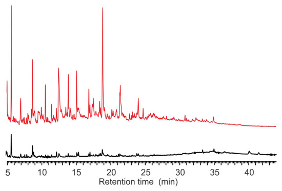 Pyrograms of A. calcoaceticus (black line) and S. aureus (red line) at 800 °C.