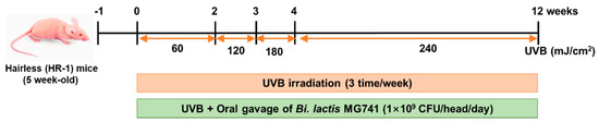 After 1-week of acclimation, animals were divided by randomized complete block design into three groups (n = 6 per group), as follows: (1) normal (no-UVB) group, (2) UVB group (60 to 240 mJ/cm2), (3) UVB + Bi. lactis MG741 strain (1 × 109 CFU/head/day). UVB irradiation was gradually increased from 60 to 240 mJ/cm2 for 12 weeks. The protocol used for the animal model induced by UVB is shown in Figure 1. The mice were administered Bi. lactis MG741 using oral gavage. The normal and only UVB-exposed group was administered maltodextrin (0.01 g/head/day). All treatment solutions were freshly dissolved on the experimental days in phosphate-buffered saline (PBS). Body weights were measured at one-week intervals during the 12-week experimental period (Figure S1).