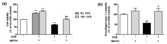 Effects of CFS from Bi. lactis MG741 on (a) cell viability and (b) procollagen type 1 c-peptide (PIP) contents in UVB-exposed Hs68 fibroblasts. Data are indicated as means ± standard error (SE, n = 3). ** p < 0.01, and *** p < 0.001 vs. no-UVB control; # p < 0.05, and ## p < 0.01 vs. UVB-exposed control.