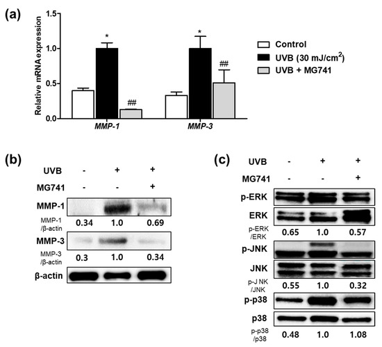 The mRNA and protein expression of matrix metalloproteinases (MMPs) and mitogen-activated protein kinases (MAPKs) in CFS from Bi. lactis MG741 treatment with UVB-exposed Hs68 fibroblasts. (a) The mRNA expression levels of MMPs in UVB (30 mJ/cm2)-exposed Hs68 fibroblasts treated with CFS (10%) from Bi. lactis MG741. (b,c) The Western blot images were measured following treatment with CFS and UVB. Fibroblasts were treated with CFS (10%) Bi. lactis MG741 for 24 h. Subsequently, the cells were exposed to UVB (30 mJ/cm2) and it was further cultured in media containing CFS for 48 h for MMPs, and 24 h for MAPKs. The ratio of each protein was shown below the blotting images and indicated to fold of UVB-exposed control. Data are indicated as means ± SE (n = 3). * p < 0.05 vs. no-UVB control; ## p < 0.01 vs. UVB-exposed control.