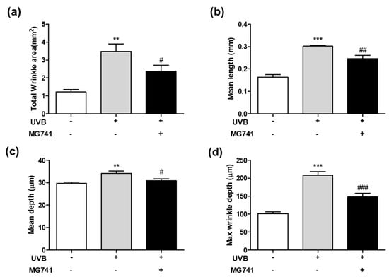 Effect of Bi. lactis MG741 on skin wrinkle formation such as (a) total wrinkle area, (b) mean length, (c) mean depth and (d) max wrinkle depth in UVB-exposed HR-1 mice. HR-1 mice were treated with Bi. lactis MG741 (1 × 109 CFU/head/day) orally and UVB irradiation on dorsal skin until 12 weeks. Data are indicated as means ± SE (n = 6). ** p < 0.01, and *** p < 0.001 vs. no-UVB control; # p < 0.05, ## p < 0.01, and ### p < 0.001 vs. UVB-exposed control.