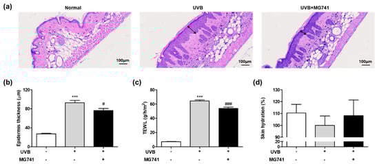 Histological examination and skin hydration of UVB-exposed dorsal skin tissue of HR-1 mice treated with Bi. lactis MG741. The animal experiment procedure is the same as described in the legend in Figure 4. (a) The images of dorsal skin sections were stained by hematoxylin and eosin (H&E) using a microscope at 100× magnification. Double arrows indicate the epidermis. At 12 weeks, the dorsal skins were collected to measure (b) the epidermis thickness (based on H&E stain), (c) TEWL, and (d) skin hydration. Data are indicated as means ± SE (n = 6). *** p < 0.001 vs. no-UVB control; # p < 0.05, and ### p < 0.001 vs. UVB-exposed control.
