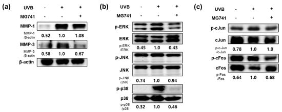 The results of Western blot analysis indicated that the protein expressions of MMP-1 (1.92-fold) and MMP-3 (1.73-fold) were clearly enhanced by UVB exposure in the dorsal skin of HR-1 mice (Figure 6a). The protein expression of MMP-3 was decreased by administration of Bi. lactis MG741; however, the MMP-1 expression did not change. As shown in Figure 6b,c, MAPKs (p-ERK, 2.22-fold; pJNK, 1.35-fold; p-p38, 3.13-fold), and AP-1 (p-c-Jun, 1.28-fold; p-c-Fos, 1.56-fold) were also markedly overexpressed in the UVB-exposed dorsal skin of HR-1 mice compared with non-exposed mice. Conversely, Bi. lactis MG741 inhibited the protein expression of p-ERK, p-p38, and p-c-Fos, with no change in p-JNK and p-c-Fos.