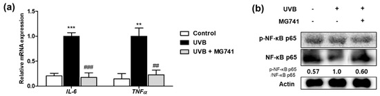 The mRNA expressions of IL-6 and TNFα were significantly increased by UVB irradiation up to 4.89- and 6.90-fold of non-exposure, respectively, whereas Bi. lactis MG741 supplementation significantly reduced these factors (IL-6, 0.17-fold; TNFα, 0.23-fold) compared with the UV-exposed control group (Figure 7a). Moreover, protein expression of p-NF-κB analyzed by Western blot increased up to 1.75-fold compared with that in the dorsal skin of HR-1 mice exposed to UVB irradiation. The protein expression of p-NF-κB, increased by UVB exposure, were improved by the administration of Bi. lactis strain MG741 (Figure 7b).