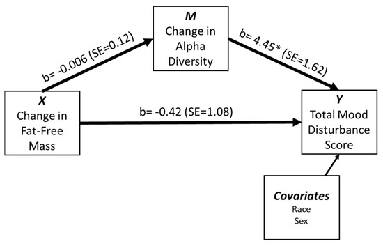 Simple mediation of Fat-Free Mass changes (X) on Total Mood Disturbance Score (Profile of Mood States) with Change in alpha diversity (as measured by PD Whole Tree Phylogeny) as a mediator. Race and sex are covariates in this model. Unstandardized regression coefficients are reported with standard error values; * p-value < 0.05.