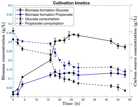 The cultivation time was extended up to 48 h. The initiation of the stationary growth phase is close to 18 h; therefore, the induction with Trp started at 16 h. The stationary phase is sustained up to 42 h of cultivation, after that, the decline phase is observed. The final biomass concentration was 0.34 g /L on glucose compared to the 0.13 g DW/L when propionate is the carbon source. These values are reached close to 18 h and kept almost invariant during the stationary phase. Glucose is almost consumed, whereas 1.92 g/L of propionate remains at 48 h. The same tendency was reported in shake flask cultivations [30].