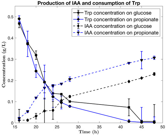 In Figure 2, it can be seen the kinetics of IAA production coupled with the Trp consumption when comparing glucose and propionate as carbon sources. Trp induction was made at 16 h after the initiation of the cultivation.