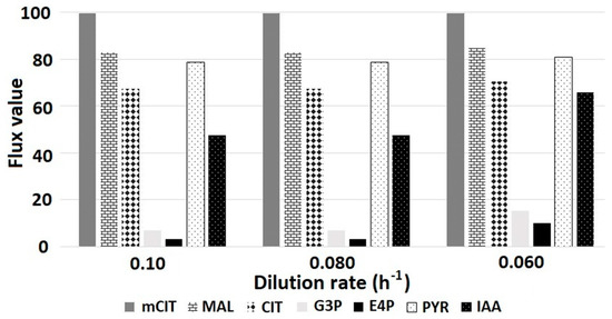 The presence of the precursor for IAA production is evaluated at different growth rates. Seven reactions that participate in the formation of the following products were selected: 2-methylcitrate (mCIT), malate (MAL), citrate (CIT), glyceraldehyde 3-phosphate (G3P), erythrose 4-phosphate (E4P), pyruvate (PYR) and IAA. This set of metabolites is involved in propionate metabolism and IAA production according to the flux distributions evaluated previously. The different flux values for these reactions were obtained by simulating different values of the specific growth rates (μ); in terms of cultivation strategies of Bacillus subtilis, this analysis suggests it is similar to performing experiments with different dilution rates in chemostat cultivation. All the values of metabolic fluxes obtained were normalized considering the specific consumption rate of propionate, in order to obtain independent data from the initial concentration and to be able to withdraw conclusions of the behavior of the network depending only on the biomass values. As can be seen in Figure 5, the values of glyceraldehyde 3-phosphate (G3P), erythrose 4-phosphate (E4P) and IAA increase as the biomass (m) decreases while simulating the optimal IAA production. Glyceraldehyde 3-phosphate (G3P) and erythrose 4-phosphate (E4P) are primary metabolic precursors for the synthesis of this phytohormone; therefore, their intracellular concentration must increase as the metabolism is diverting resources towards obtaining these precursors [15].