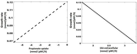 Simple robustness analysis of IAA formation metabolism and propionate consumption as a function of growth rate. Negative values of the propionate uptake are indicating that this substrate is consumed.