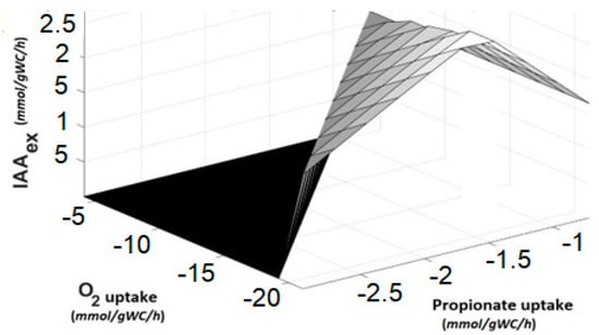 To evaluate the changes in the oxygen and propionate uptake in the IAA production, the double robustness analysis is presented in Figure 7. The surface graph presents the flux towards IAA as a function of oxygen and propionate uptakes (negative values), the maximum flux value of IAA is predicted when oxygen uptake has the maximum value, but not for propionate uptake. For this simulation, the Trp uptake flux was fixed, and the excess of propionate does not imply an increment in IAA. On the other hand, the increase in O2 availability increases the activity of the enzyme Trp 2-monooxygenase allowing a greater synthesis of IAA.