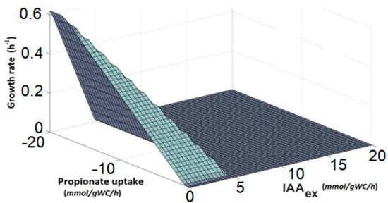 The modified iBSU1147 genomic-scale metabolic model generates a Phenotype Phase Plane analysis (PhPP) which describes the metabolic transition of B. subtilis depending on the availability of sodium propionate and IAA production. The three-dimensional response surface corresponds to the growth rate variation for each pair of rates of propionate uptake and IAA formation in the x–y plane, see Figure 8. All flux distributions in the metabolism of B. subtilis are limited to a solution region where each distribution reflects a feasible metabolic flux [44]. In this particular case, we were interested in the relationship between the qs of the propionate and the growth rate during the pseudo-stationary phase and during the formation of the product. As shown in Figure 8, low values of propionate uptake are not enough to complete the metabolic functions required for cell maintenance and production of IAA. As this rate value increases, the growth rate begins to increase linearly.