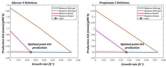 Figure 9 presents the solutions found from OptKnock. The lines are the limits when maximizing and minimizing the IAA production in the mutant and wild type network with their respective biomass yield, this is, when the IAA production is maximized or minimized the biomass production is calculated. It can be seen that in either network, wild type and mutant, the linear relationship has a similar dependency. The optimal point lies on the horizontal edge of the optimization front and indicates that the maximization of biomass and IAA production are coupled in the scenarios when two and four deletions are made, see Table 2.