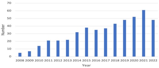 Numerous mathematical models have been developed to study cholera dynamics. In order to have an understanding of the volume of research activity in this area, we conducted a simple search in October 2022 using Google Scholar for the number of cholera-modeling studies published in the last 15 years (2008–2022). The search was based on the title of any article containing the keyword “cholera” and at least one of the following keywords: “mathematical”, “model”, “models”, “modeling”, “modelling”, and “dynamics”. The records returned by Google Scholar were then individually screened, duplicates were identified and removed, and those items not related to mathematical modeling were also removed. The final search results were summarized in Figure 1. Our search was not meant to be exhaustive, as it excluded those cholera-modeling studies that do not have one of those aforementioned keywords in their titles and those that are not indexed by Google Scholar. Nevertheless, even with this incomplete search, we have found almost 500 pieces of modeling work for cholera published over the last 15 years, as shown in Figure 1. We see a clear pattern that the number of articles for cholera modeling has been fast growing, with an increase of more than 10 times from 2008 to 2021.