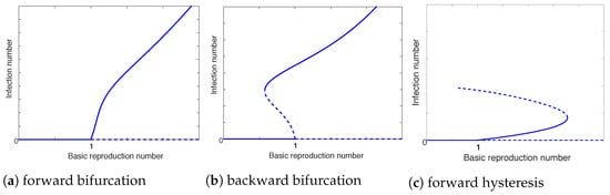 Three different types of bifurcation behaviors: (a) forward bifurcation; (b) backward bifurcation; (c) forward hysteresis. Solid and dashed lines represent stable and unstable equilibria, respectively. The horizontal axes represent the disease-free equilibria, and the lines above the horizontal axes represent the endemic equilibria.