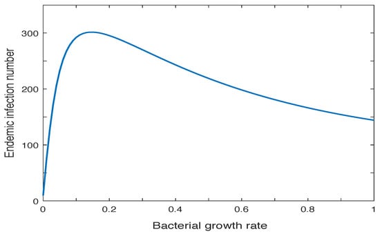 One interesting result of the modeling study in [] is that the infection number at the population level does not always monotonically increase with the pathogen load. For example, Figure 3 shows the relationship between the infection number at the endemic state and the bacterial growth rate inside the human body. As the bacterial growth rate increases, the infection number first increases and reaches a peak, and then decreases afterwards. Note that the pathogen load, though varied for different individual hosts, is always positively correlated to the bacterial growth rate. An implication is that a decrease of the pathogen load may not necessarily lead to a reduction of the population-level infection in the long run, unless the bacterial growth rate can be pushed to a small neighborhood of 0 where a positive correlation exists between the two variables.