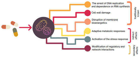 However, beyond traditional knowledge, many studies have been carried out that highlight the complex events involved in cell death caused by antibiotics, providing evidence to support the theory that lethality could not be strictly excluded from the direct effects of drug–target interaction, as traditionally postulated [2], and support the updating of the concept based on the antibiotic response characterized by the omics studies reported by Brazas and Hancock [14], where more specifically, a range of observational findings in numerous bacterial strains consistently suggest adverse roles for either indirect effects (e.g., activation of stress response and adaptive metabolic responses) or secondary effects (e.g., modification of regulatory and network interactions) in mortality arising due to antibiotic treatment (Figure 2).