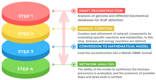 With the sequencing of the first whole-genome sequences during the mid-1990s [17], in principle, the possibility of identifying every gene product implicated in complex biological functions in a wide variety of organisms became feasible. Biochemical knowledge of metabolic processes allowed for the reconstruction, at the genome scale, of the metabolic networks of a particular organism in a biochemically complex manner [91,92]. These metabolic networks, or GEMs, are currently the only approach that allows the metabolism of an organism to be modeled and analyzed through a global analysis [93]. The construction of GEMs is tedious work. Thiele and Palsson [94] defined 96 steps to obtain a high-quality metabolic model; however, these can be summarized in four principal steps—draft reconstruction, manual curation, mathematical model conversion, and network analysis (Figure 5).