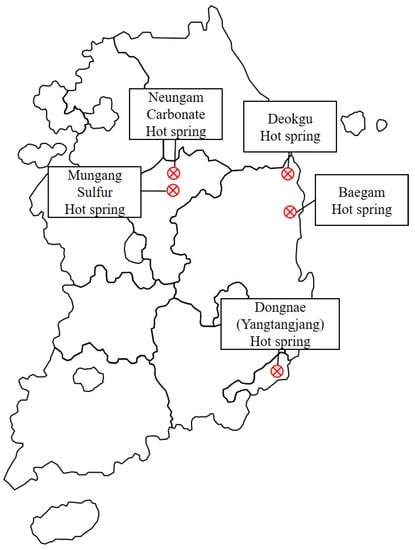Map of the hot spring area in Korea where the samples were collected for this study. Neungam and Mungang hot springs are located in Chungju, Deokgu and Baegam hot springs are located in Uljin, and Dongnae (Yangtangjang) hot spring is located in Busan, respectively.