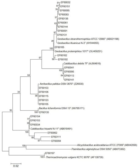 Within the scope of this study, a total of 29 strains were isolated from hot spring water samples. The screening results showed that three strains were isolated from the Neungam Carbonate, sixteen strains from the Mungang Sulfur, two strains were isolated from the Deokgu, six strains were separated from the Baegam, and two strains from the Dongnae hot springs, respectively. All the strains showed growth on one of the complex media (nutrient agar, R2A, tryptic soy agar), which are widely used for massive cultivation of bacteria in industrial processing, meaning that newly isolated 29 thermophilic bacteria can be cultivated more easily using industrially applied commercial media. Growth of all the strains occurred between 45 °C and 65 °C, indicating that the isolated strains are thermophiles. All the strains showed growth at pH 7.0. On the other hand, any of the strains could grow at acidic (pH 4.0) and alkaline (pH 9.0) conditions. The halophilic nature of the strains showed that all the strains could tolerate 3% (w/v) NaCl concentration and 10 strains could tolerate 6% (w/v) NaCl concentration. Moreover, isolates EF60115, EF60123, and EF60155 could tolerate up to 9% (w/v) NaCl concentration. Any of the strains could tolerate up to 15% (w/v) NaCl condition (Table 2).
