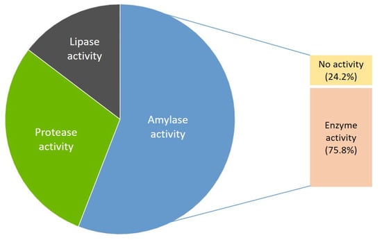 Bacterial isolates were screened for extracellular amylase, protease, and lipase activity. Among the isolates, at least one extracellular enzyme activity was detected in 22 strains (75.9%). Amylase activity was detected in nineteen strains (65.5%), protease activity in ten strains (34.5%), and lipase activity in five strains (17.24%) (Figure 3). The degree of hydrolytic capacity for degrading a certain substrate was evaluated and shown as enzyme intensity (EI) to show which of the isolates produced larger amounts of the enzymes (Table 5). The amylolytic activity was the most common among isolates with the highest amylase activity in strains EF60154 (EI 4.02), EF60094 (EI 3.33), EF60111 (EI 3.16), and EF60034 (EI 3.1) and strains EF60165 (EI 3.67), EF60131 (EI 3.12), EF60136 (EI 3.09), and EF60061 (EI 3.08). The highest protease and lipase activity was detected in strains EF60192 (EI 10.71) and EF60131 (EI 3.46), respectively. Two strains, EF60083 and EF60192, produced all the tested hydrolytic enzymes.