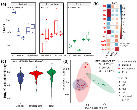 The α- and β-diversity of A. sparsifolia root-associated mycobiome. (a) Chao 1 of root-associated mycobiome in different host development times. (b) Pearson correlations between Chao 1 and soil properties. ***, p < 0.001; **, p < 0.01. All p values were corrected by FDR. (c) The Bray-Curtis dissimilarity at the ASV level among three root-associated compartments. Letters indicate significant differences according to the Kruskal Wallis test. (d) Principal coordinate analysis (PCoA) in combination with permutational analysis of variance (PERMANOVA). Ellipses indicate a 95% confidence interval. ***, p < 0.001. Abbreviations: 30 d, 30 days old; 60 d, 60 days old; 90 d, 90 days old; 2 a, 2 years old; perennial, over 3 years old. TN, total nitrogen (g/kg); TP, total phosphorus (g/kg); TK, total potassium (g/kg); AN, available nitrogen (mg/kg); AP, available P (mg/kg); AK, available potassium (mg/kg); EC, electrical conductivity mS/cm); SWC, soil water content; SOM, soil organic matter (g/kg); SLA, specific leaf area (cm2/g). C × T, interaction between compartment and development time.
