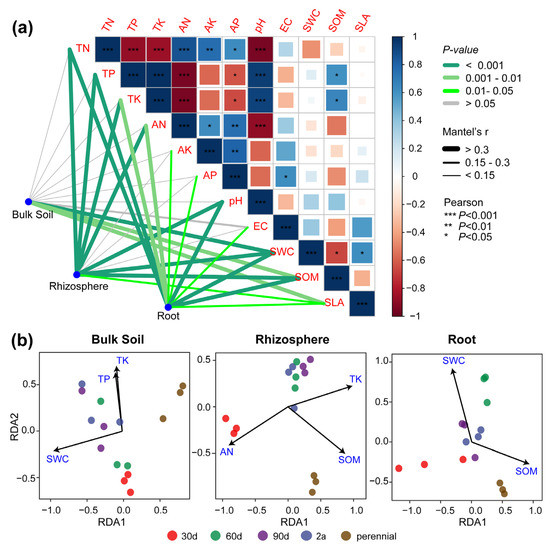 The correlations between the mycobiome and environmental factors. (a) Mantel test results show Spearman’s correlations between the mycobiome and environmental factors. The correlation heat map on the upper right shows Pearson’s correlations between environmental factors. (b) Redundancy analysis (RDA) results show the relationships between edaphic factors and genus-level community structures tested by 999 permutations. The specific partition of these main edaphic factors is presented in Figure S3. Abbreviations: 30 d, 30 days old; 60 d, 60 days old; 90 d, 90 days old; 2 a, 2 years old; perennial, over 3 years old. TN, total nitrogen (g/kg); TP, total phosphorus (g/kg); TK, total potassium (g/kg); AN, available nitrogen (mg/kg); AP, available P (mg/kg); AK, available potassium (mg/kg); EC, electrical conductivity (mS/cm); SWC, soil water content; SOM, soil organic matter (g/kg); SLA, specific leaf area (cm2/g).