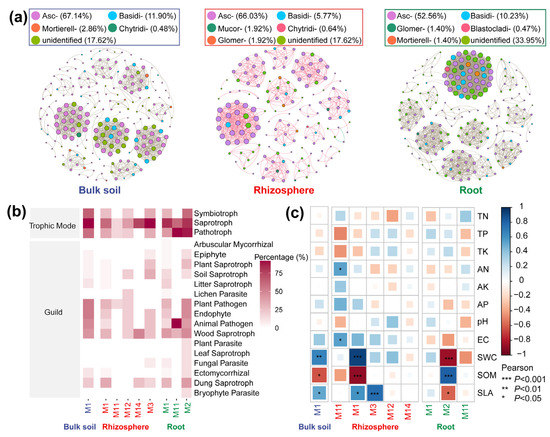Co-occurrence networks of A. sparsifolia root-associated mycobiome. (a) Compartment-specific networks. Nodes represent ASVs. Their colors distinguish the phyla they belong to, and their size represents the degree. (b) The functional redundancy of fungal co-occurrence network modules among different compartments. (c) The Pearson’s correlation between module eigengenes and environmental factors. The M1-M14 represent main modules. Abbreviations: TN, total nitrogen (g/kg); TP, total phosphorus (g/kg); TK, total potassium (g/kg); AN, available nitrogen (mg/kg); AP, available P (mg/kg); AK, available potassium (mg/kg); EC, electrical conductivity (mS/cm); SWC, soil water content; SOM, soil organic matter (g/kg); SLA, specific leaf area (cm2/g).