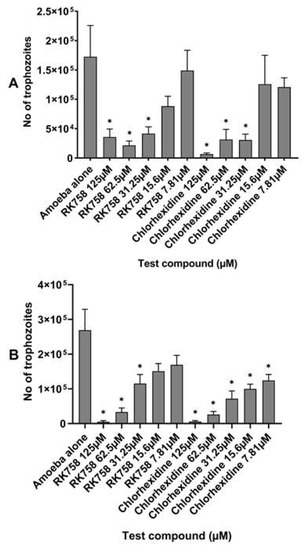Briefly, 2 × 105 trophozoites/mL were incubated with the peptidomimetic RK-758 or chlorhexidine in 24-well plates at concentrations ranging from 125 µM to 7.81 µM in PYG [46]. The PYG medium alone was used as a control. After incubation at 30 °C for 48 h, the number of viable trophozoites was determined using a Neubauer haemocytometer after the addition of 0.1% of trypan blue to each well as mentioned.