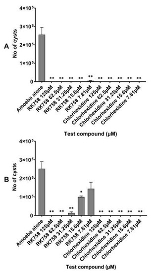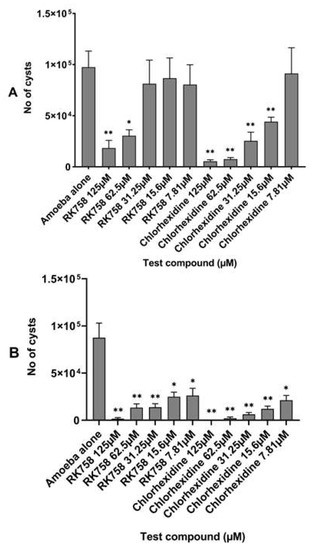 Inhibition of cysts formation by the peptidomimetic RK-758 in comparison with chlorhexidine against Acanthamoeba castellanii ATCC30868 (A) and A. castellanii 044 (B). In brief, 5 × 105 A. castellanii trophozoites were incubated with the peptidomimetics RK-758 and chlorhexidine at 30 °C for 72 h after which cysts were determined by solubilising trophozoites adding 0.25% SDS. The number of cysts was counted using the Neubauer haemocytometer. The results showed significant anti-Acanthamoeba activity when compared to the negative control (amoeba alone). ** p < 0.001; * p < 0.05 using the two-sample t-test and two-tailed distribution.