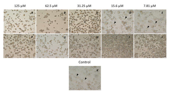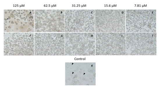 Inhibition of trophozoite emergence from cysts of Acanthamoeba castellanii 044 by the peptidomimetic RK-758 (A–E) in comparison with chlorhexidine (F–J), with concentrations of both ranging from 125 µM to 7.81 µM. In brief, 5 × 105 A. castellanii trophozoites were incubated with the peptidomimetics RK-758 and chlorhexidine at 30 °C for 72 h and observed for the emergence of trophozoites. PYG alone was used as a control (K). Peptidomimetic RK-758 inhibited the trophozoite emergence between concentrations of 125 µM and 31.25 µM (A–C) whereas the chlorhexidine inhibited their emergence between 125 µM and 7.81 µM (F–J). Arrowheads indicate trophozoites.