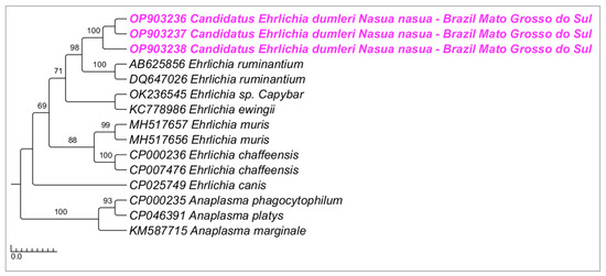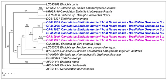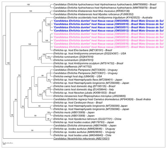 Phylogenetic tree inferred by the Bayesian method and based on the 16S rRNA gene from Ehrlichia spp. sequences obtained from blood from ring-tailed coatis (Nasua nasua) sampled in Campo Grande city, Mato Grosso do Sul state, Brazil. Sequences detected in the present study are highlighted in bold blue (PEP—genotype 1) and pink (VBA—genotype 2).