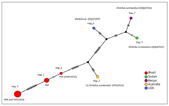 In order to evaluate the genetic distance between the two Ehrlichia sp. sub-clades detected in the present study (PEP x VBA), median joining network (MJN) and haplotype analyses with fourteen 16S rRNA sequences that clustered together or in a clade near those sequences detected in coatis (Table 3, Figure 7) was performed. As a result, seven genotypes were found with 34 variable sites. In the MJN analysis, sequences detected in coatis from VBA and the one detected in E. barbara, Mato Grosso, Brazil (MZ130191) were represented by the same haplotype (haplotype #4). On the other hand, sequences detected in PEP clustered in two different genotypes (haplotype #1 and #2), also apart from haplotype 3, which was represented by ‘Ca. Ehrlichia occidentalis’ (KY425523). Sequences positioned in a clade near sequences detected in coatis (E. ruminantium DQ647615, DQ647616, and Ehrlichia sp. DQ324367) in the BI were represented by different genotypes (#5, #6, and #7) (Figure 7). The genetic distance (p-distance) between the two detected haplotypes detected from coatis (VBA xPEP) ranged from 0.010 to 0.012 (Supplementary Materials).